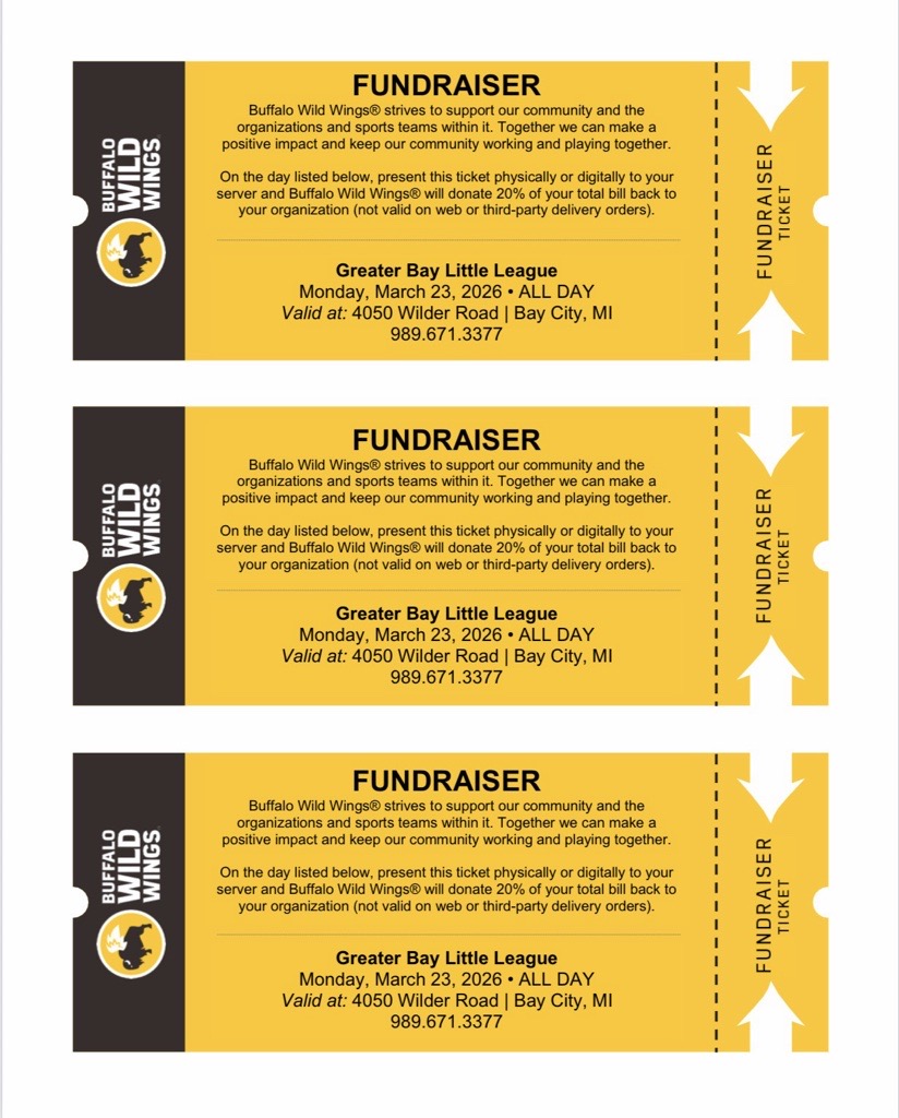 Present this ticket digitally or physically to your server at Buffalo Wild Wings' Wilder Rd location in Bay City, and 20% of your total bill will be donated to Greater Bay Little League.